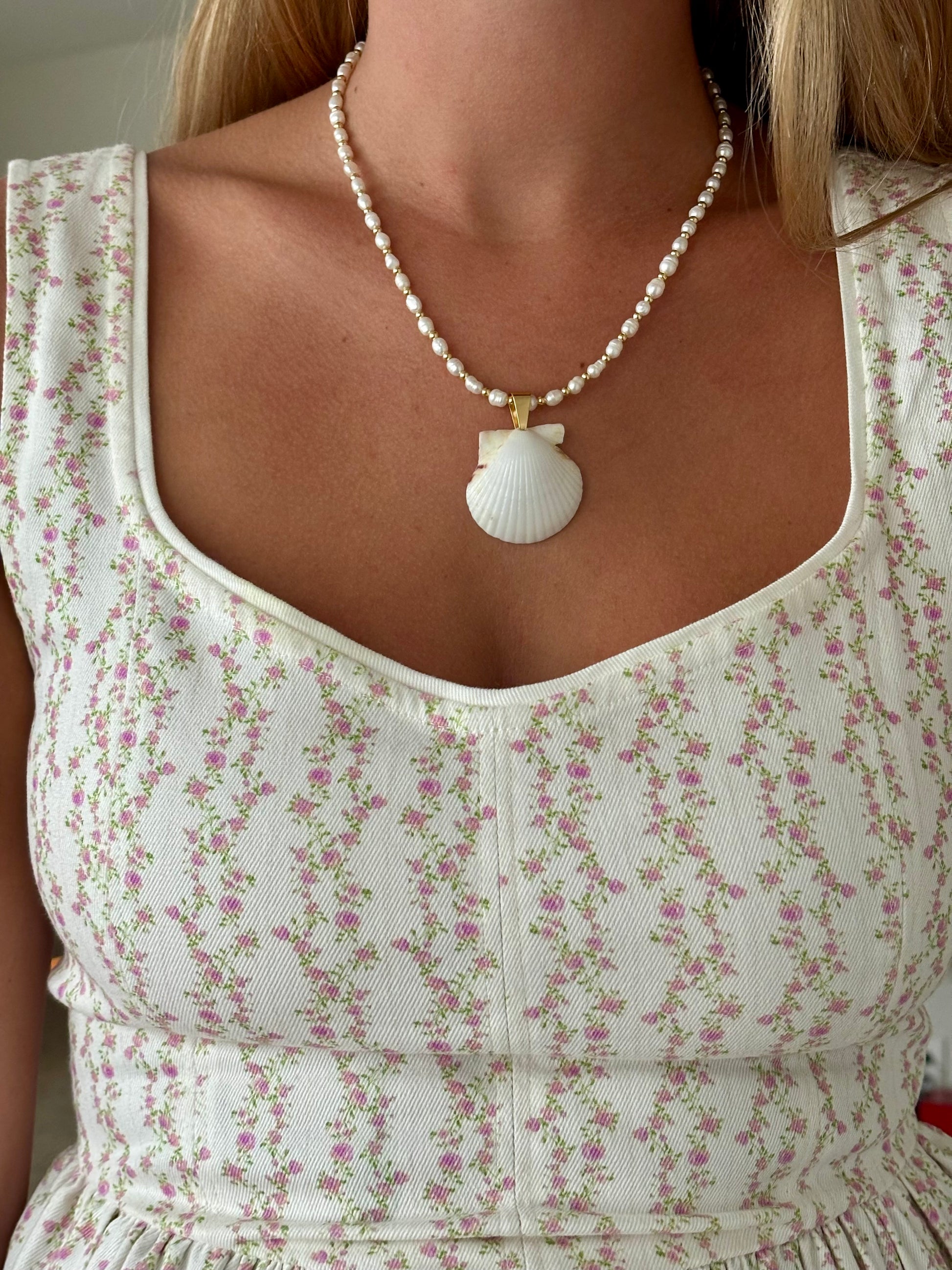 Handmade with freshwater pearls and a locally found seashell, this necklace captures timeless coastal beauty. Finished with non-tarnish gold filled and plated accents, it's designed to shine season after season. Each shell is unique, making every piece one of a kind.