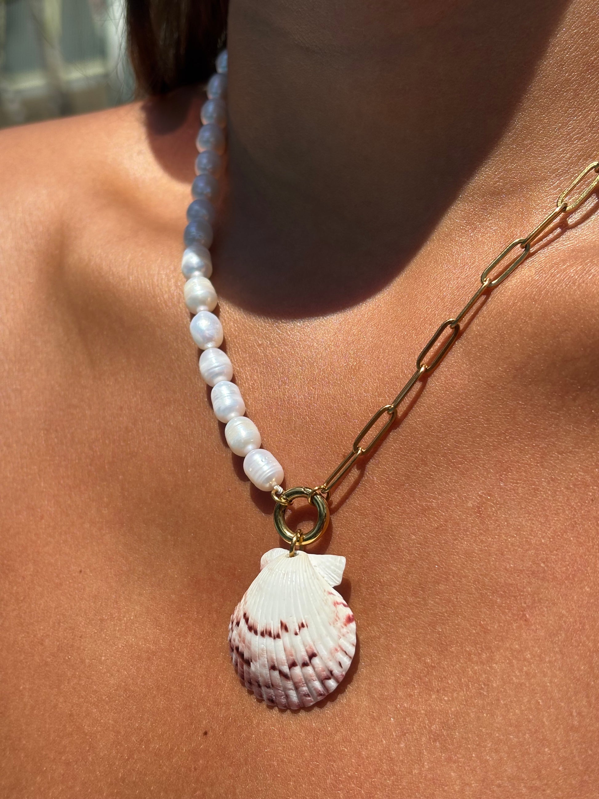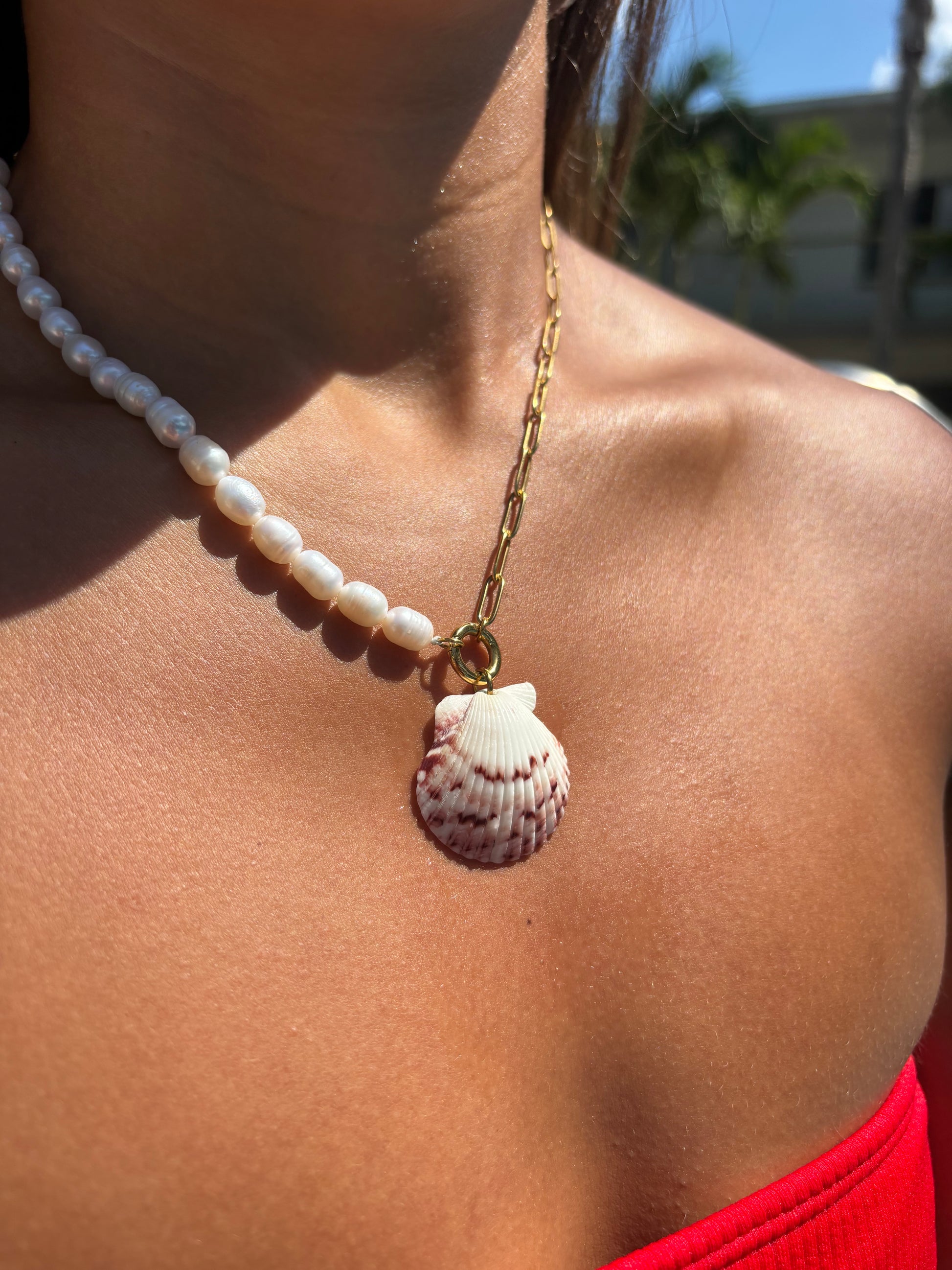 Handmade with a blend of faux freshwater pearls and a sleek paperclip chain, this necklace is finished with a one-of-a-kind scallop shell pendant. Each shell is uniquely crafted by nature, every shell will look a little different.